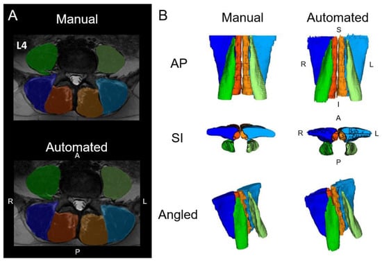 (A) Axial lumbar spine muscle segmentations at the L4 vertebral level from manual segmentation and an automated computer-vision model overlaid over a spin-echo T2-weighted image. (B) Three-dimensional renderings of the lumbar spine muscle segmentations. The muscle groups segmented include the multifidus (left = light orange, right = dark orange), erector spinae (left = light blue, right = dark blue), and psoas major (left = light green, right = dark green). L = left, R = right, A = anterior, P = posterior, S = superior, I = inferior. Adapted from Wesselink et al., 2022 [].