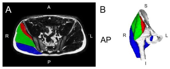(A) Axial right hip muscle segmentation overlaid over a fat image from Dixon fat–water MRI. (B) Three-dimensional renderings of the hip muscle segmentations. The muscle groups segmented include the gluteus maximus (blue), gluteus medius (green), and gluteus minimus (red). Adapted from Perraton et al., 2024 [].