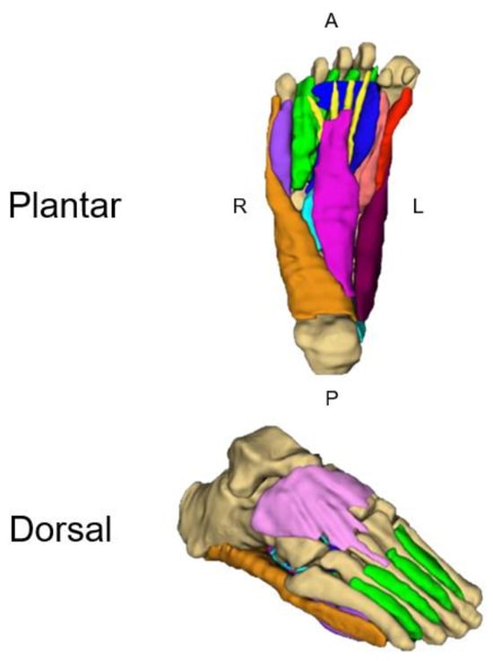 Three-dimensional renderings of the intrinsic foot muscles from Dixon fat–water imaging. The muscle groups segmented included the abductor hallucis (plum), quadratus plantae (light blue), flexor digitorum brevis (fuchsia), abductor digiti minimi (orange), lumbricals (yellow), extensor digitorum brevis (pink), flexor hallucis brevis medial head (red), flexor hallucis brevis lateral head (salmon), adductor hallucis (dark blue), flexor digiti minimi (purple), and plantar and dorsal interossei (green). Adapted from Franettovich et al., 2021 [].