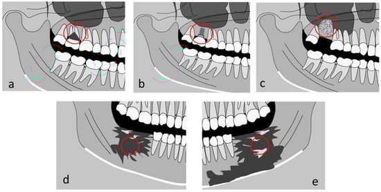 Examples of application of texture analysis to dentomaxillofacial images: (a) periodontal application to dentomaxillofacial images; (b) predictive study on the stability of dental implants; (c) study on sinus-lift grafts; (d) characterization of malign lesions; and (e) study on osseous lesions due to medication-related necrosis.