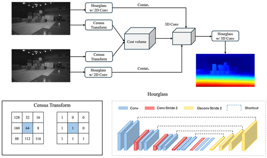 Significant enhancements in the cost aggregation phase have been reported in the literature [22,23,24]. Chang et al. introduced the application of the spatial pyramid pooling (SPP) module for feature extraction, alongside stacked hourglass structures for cost aggregation [25]. Furthermore, advances have been made in accelerating stereo matching by utilizing highly optimized, hand-crafted features such as census transformations and sum of absolute differences [26]. Both theoretical advancements have been integrated into our methodology.