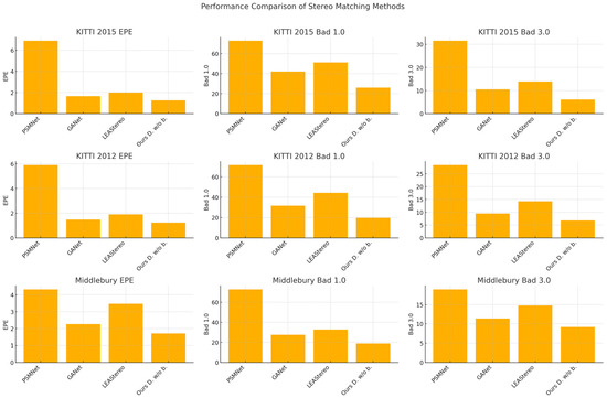 We adopt the provided protocols with two datasets, employing three key metrics for assessment [44,45]: end-point error (EPE) in pixels, Bad 1.0 [%], and Bad 3.0 [%]. EPE measures the disparity end-point error in pixels, while Bad 1.0 [%] and Bad 3.0 [%] indicate the percentage of pixels with disparity errors exceeding one pixel and three pixels, respectively.