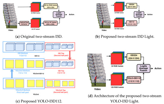 - In this section, we put together the two extensions to further enhance the performance of the two-stream I3D Light model. Figure 1c shows the combined YOLO-I3D Light model. The YOLO-I3D model (explained in Section 3.2) is used in the I3D112 branch of the two-stream I3D Light model (explained in Section 3.1). This results in the new two-stream YOLO-I3D Light model containing the YOLO-I3D112 branch as shown in Figure 1d.