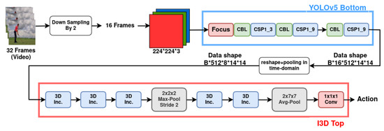 - To make the data sizes compatible, we use an input image resolution of 224 × 224, which generates an output feature map of 512 × 14 × 14 from the YOLO bottom part for each image (512 is channel number and 14 × 14 is the spatial resolution). In order to simulate the effect of a stride size 2 in the first layer of the 3D CNN module in the I3D model, we use a downsampling-by-2 in the data feeding pipeline of YOLO-I3D. During training, the input to YOLO-I3D is a batch of videos (batch size is denoted by B in Figure 2). Each video is sampled to 32 frames of images, and the data shape of the stacked feature maps of YOLO part of YOLO-I3D is B × 16 × 512 × 14 × 14. In order to simulate the pooling layer of the bottom part of the I3D model, we pool the output from the YOLO part of YOLO-I3D. Therefore, the data shape becomes B × 8 × 512 × 14 × 14. In order to match the input data shape of the top part of the I3D model, we switch the order of frame number 8 and the channel dimension 512. So the final shape of the data fed to the top part of I3D model is B × 512 × 8 × 14 × 14.