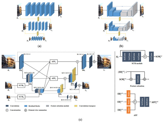 It has been demonstrated that image blur can be better handled from multi-scale images [24]. Different from multiple stacked sub-networks, the multi-input multi-output U-shaped network (MIMO-UNet) [22] is mainly based on a single U-Net with multi-scale inputs and outputs. As shown in Figure 1c, the encoder and decoder are composed of encoder blocks (EBs) and decoder blocks (DBs) at three scale levels. In the finest level, the EB1 is used to extract the features from the blurry image B1. Then, the features from the finest level are downsized using a convolution layer with stride of 2 and combined with the second-level features extracted from the blurry images B2 using a feature attention module. The features at the second level are extracted using a shallow convolutional module (SCM), which consists of a couple of 3 × 3 and 1 × 1 convolutional layers. The output of SCM2 is element-wise multiplied with the downsized features from the finest level in the feature attention module. The fused features are considered to contain complementary information from different levels and then further refined by the following EB2. The process in the third level is similar to the second level. Moreover, MIMO-UNet utilizes asymmetric feature fusion (AFF) modules to fuse the outputs of EBs from different scales as shown in Figure 1c. The output of AFFs is transferred to the corresponding DB. Owing to AFF modules, DBs can exploit multi-scale features in a single U-Net, contributing to improving the deblurring performance. The intermediate supervision is executed to each DB, where the image restoration can be represented as