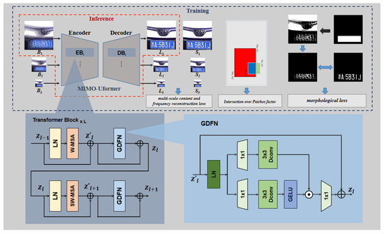The overview of the proposed deblurring method in vehicle-surveillance scenarios is shown in Figure 3. This network is mainly based on a novel designed transformer-based network, named MIMO-Uformer, which is developed from the architecture of MIMO-UNet. Concretely, the EBs and DBs are made up of stacks of transformer blocks, of which each mainly contains a W/SW-MSA and a GDFN module. During training, the image patches are first randomly cropped and rescaled based on factors of 1/2 and 1/4 to form a multi-scale sequence of blurry patches Bi (i = 1, 2, 3). Each Bi is fed into the corresponding EBi, and DBi generates the latent sharp patch Li, which is combined with the label patch Si to compute the content loss and the multi-scale frequency reconstruction loss as illustrated in Equations (2) and (3). Moreover, an Intersection over Patches, i.e., IoP factor, is proposed to compensate for the loss term generated by the moving vehicle. A supervised morphological loss is also introduced to enhance the restoration of the characters on license plates. Then, the network only receives B1 as input and exports L1 at the inference stage.