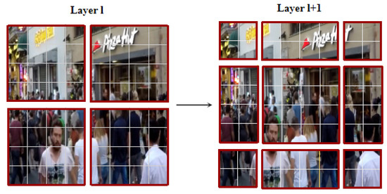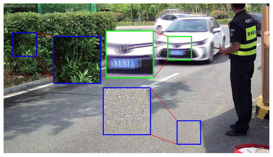 For the most widely used datasets for image deblurring, such as GOPRO [10], RealBlur [30], and Kohler [31], the motion blur is mainly generated by the shaking of the camera, and little is produced by moving targets. It is obvious that the motion blur in these datasets is different from that in the vehicle-surveillance images where the motion blur is mainly caused by the moving vehicles. In training stage, a batch of randomly cropped rectangular patches, instead of the whole images, is fed into the network as the input. For the vehicle-surveillance image as shown in Figure 5, the randomly selected patches are more probably from the clear regions (blue blanks) than from the blurry region (green blank). These patches from the background hardly produce loss and thereby affect the back-propagation to update the network, leading to unpredictable convergence of the network. Therefore, more blurry patches are expected to be selected as the input.