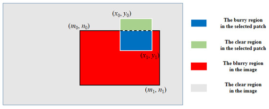 To solve the problem, a self-adaptive loss compensation factor based on the ratio of the areas of the blurry region in the input patch, called Intersection over Patch (IoP), is proposed. As illustrated in Figure 6, the square region (blue and green) with white boundaries stands for the selected patch, while the rectangular region (red and blue) with black boundaries represents the blurry region. The coordinates, represented as (Xmin, Ymin, Xmax, Ymax), of the patch and blurry region are respectively shown as (x0, y0, x1, y1) and (m0, n0, m1, n1). During training, the coordinates of the cropped patches are recorded and computed together with the provided coordinates of the blurry regions to calculate the IoP factors. The area of the intersection between the patch and blurry region is calculated as