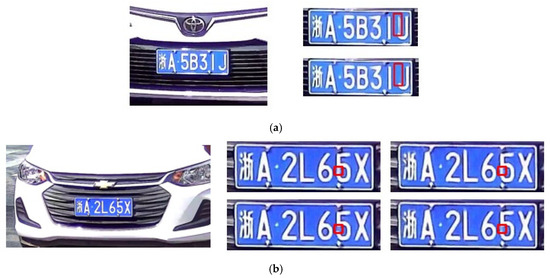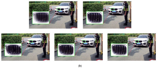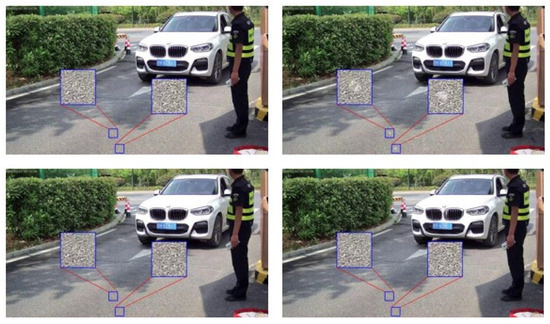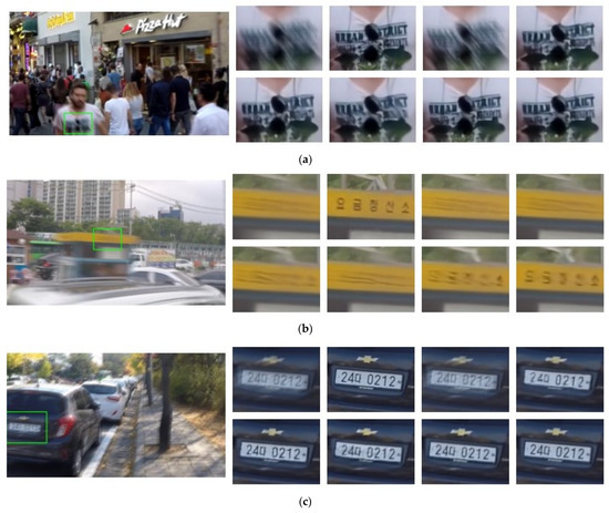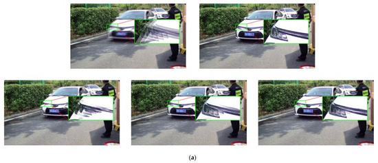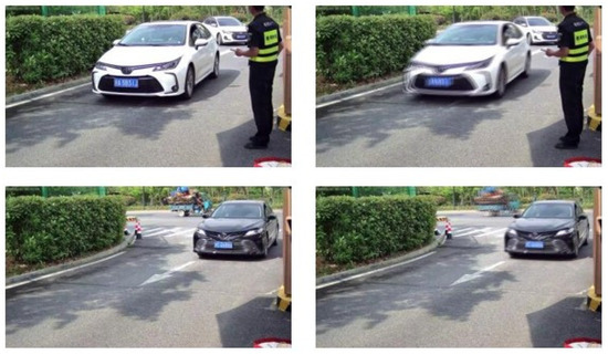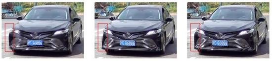 We add the adjacent frames and take the average value to synthesize a blurry image and pick the middle frame as the sharp ground-truth. In this way, only the moving vehicles suffer from motion blur, while the background remains clear in the self-established dataset, as shown in Figure 8. We totally collected 25 videos, of which each records an independent vehicle passing the entrance. We selected 20–50 consecutive frames from each video and established a dataset containing 845 “sharp and blur” pairs of vehicles altogether, wherein 535 pairs made up from 16 videos are selected as the training set, and the left 310 pairs from 9 videos serve as the testing set. The ratio between the training and testing pairs are similar with the GOPRO dataset, of which the proportions of training and testing pairs are approximately 65% and 35%, respectively. In addition, the coordinates of the regions of the vehicle and license plate are also required in the proposed method. A well-trained object-detection model is implemented based on the self-collected images to output the coordinates of the vehicles and license plates. For every image, we execute binarization to the regions of the license plates to generate the supervised morphological labels.