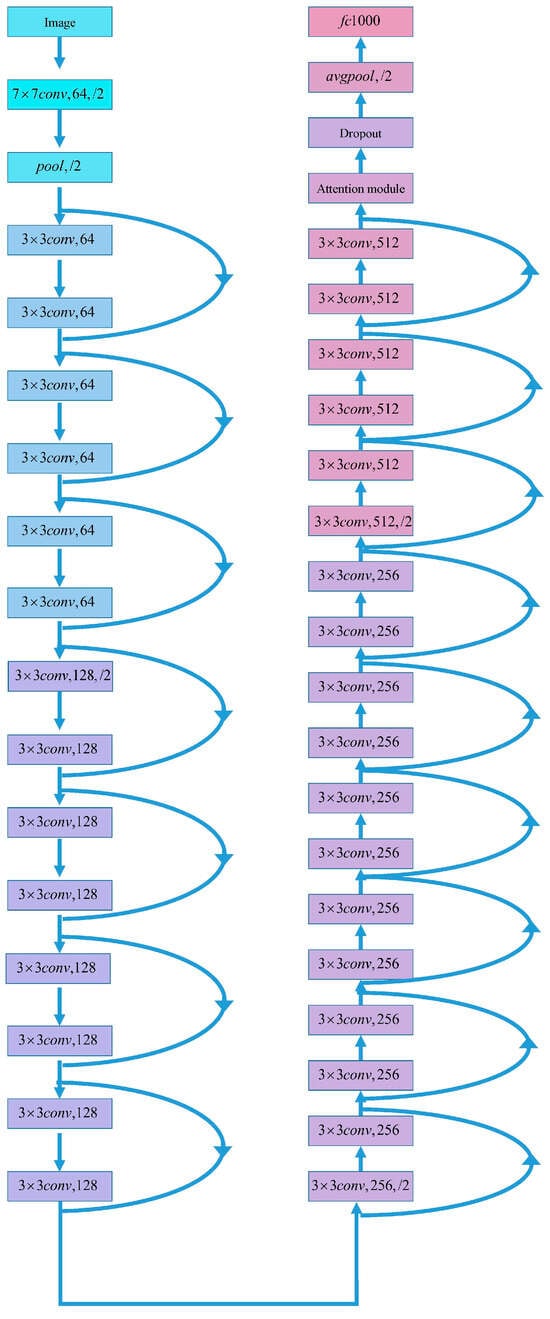 Figure 1 presents our designed ESA-ResNet34 network. The ESA-ResNet34 network is built upon the ResNet34 architecture, known for its deep residual learning framework. ResNet34 employs skip connections to mitigate the vanishing gradient problem, enabling the training of deeper networks [17]. Our modifications to the ResNet34 architecture include the following: