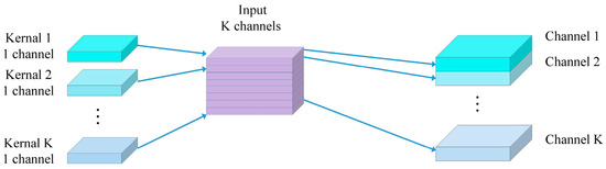 Depthwise separable convolutions consist of two main parts: depthwise convolutions and pointwise convolutions [37]. Depthwise convolution is computationally simple. As illustrated in Figure 3, it involves applying a convolutional filter to each input channel separately and then concatenating the outputs from all filters to obtain the final output of the depthwise convolution. The number of output channels is equal to the number of filters used. Since depthwise convolution applies one filter per channel, the number of output channels for each individual channel is also one. For example, if the input feature map has the dimensions (4, 64, 224, 224), applying one filter per channel results in 64 feature maps with one channel each. These 64 feature maps are then concatenated to produce an output feature map with 64 channels. Depthwise convolution is shown in Figure 3, while standard convolution is depicted in Figure 4.