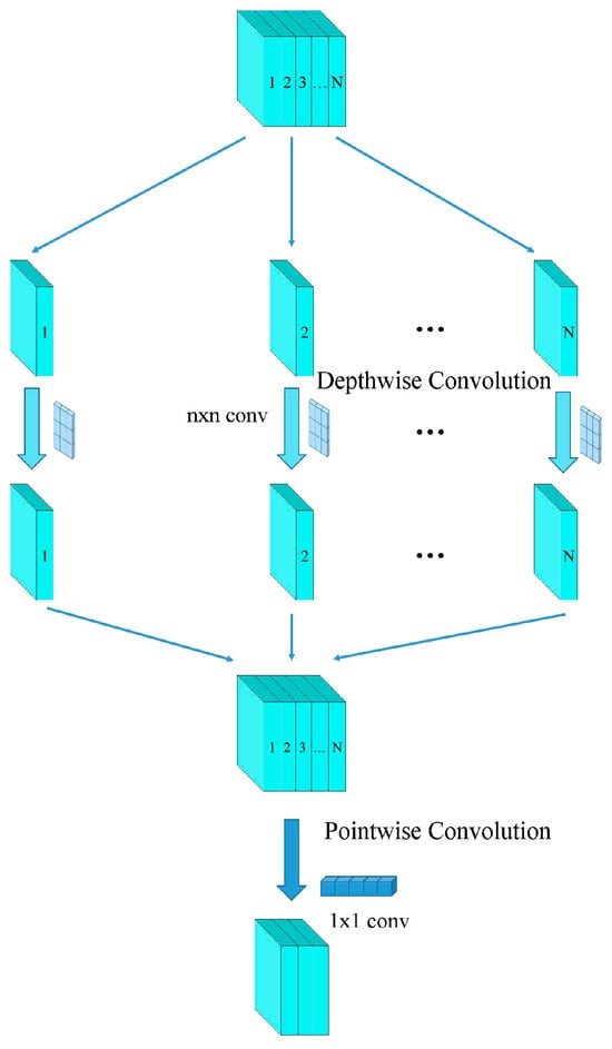 First, we apply a depthwise convolution to the input feature map, which adjusts the spatial dimensions of the feature map without changing the number of channels. Then, a pointwise convolution is used to adjust the number of channels without altering the spatial dimensions of the feature map. This approach significantly reduces the computational load of convolution operations, thereby lowering the overall complexity of the model.