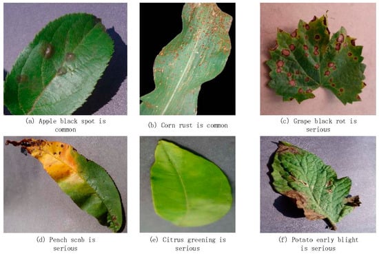 The dataset used in this study is the AI Challenger 2018 pest and disease detection dataset. This dataset comprises a total of 50,000 annotated images, covering 61 diseases across 10 types of plants. We used the training set from AI Challenger as our training data and the validation set from AI Challenger as our test data. Example samples from the experimental dataset are shown in Figure 6.