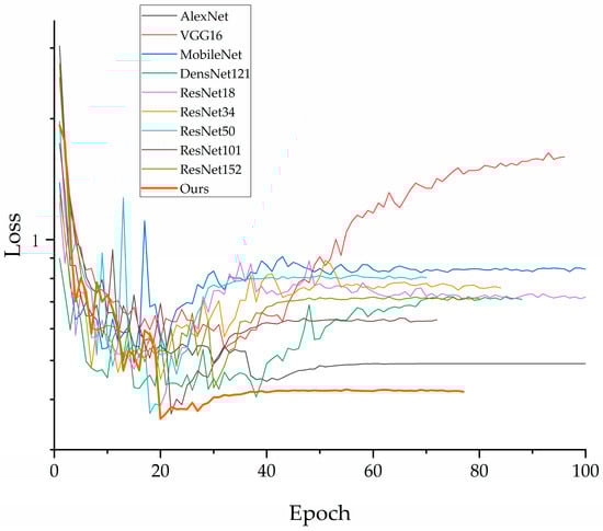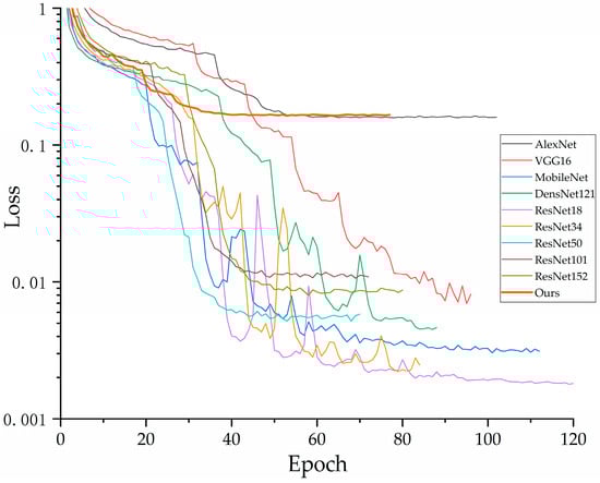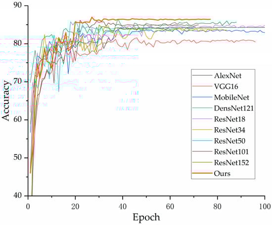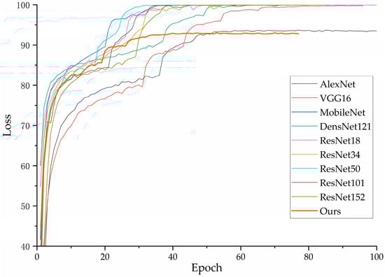 In the experiments, we compared our improved model with AlexNet, VGG16, MobileNet, DenseNet, and other branches of ResNet. To ensure the reliability of the experimental results, all comparison models were implemented using the official models provided in Torchvision. Additionally, to facilitate the reproducibility of the results reported in this paper, we fixed the random seed to 2022. The training parameters utilized the Adam optimization method, with a weight decay of 1 × 10−4, a learning rate of 0.001, and the learning rate decay mode set to minimum mode. The learning rate reduction factor was set to 0.5, the batch size was 128, and the number of epochs was 200. The model was terminated early if there was no improvement in accuracy after 50 consecutive epochs. The loss function used was the cross-entropy loss, calculated as follows: