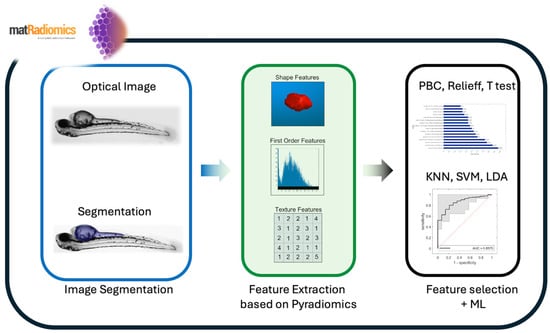In this study, we extended matRadiomics to the preclinical domain. Our case study on zebrafish models demonstrated the platform’s ability to discriminate biological outcomes early, a critical step in preclinical research. Our results suggest that an early automated analysis at 72 hpf can predict treatment toxicity, potentially reducing the need for more laborious subsequent assessments. Although our study highlights the potential of matRadiomics, some limitations remain. The impact of parameter settings for the feature extraction process for high-resolution images requires further investigation. Furthermore, expanding the range of ML models and validating the platform on different preclinical models are essential for its wider adoption. Despite these limitations, our work represents a significant step towards integrating radiomics into preclinical research, accelerating drug discovery and development.