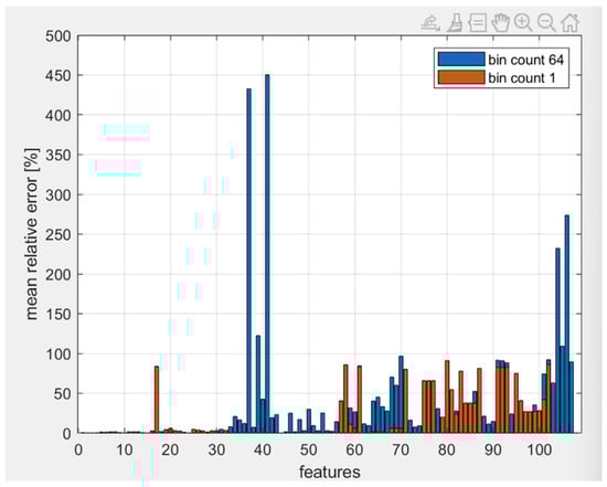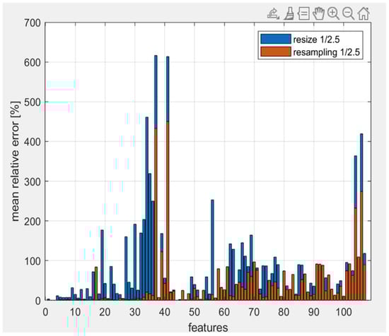 Figure 2 shows that the resampling method gives better results than resizing. In addition, the error with the resampling method (M = 38.22%) is lower than the resizing one (M = 79.96%) for 81 out of 107 values. The two-tailed t-test for paired samples yielded a p-value of << 0.05, suggesting that the observed differences were statistically significant and not due to random variation. Consequently, resampling proved to be the most effective preprocessing method. However, the total average error remained high. The largest deviations were observed in gray-level features, prompting us to alter the bin count to one, thereby eliminating the extraction of certain gray-level-related features to see if this reduced the error. This adjustment resulted in smaller mean relative errors compared to using a bin count of 64. Figure 3 shows the mean relative error graphically, while the Table 1 shows the total average error for bin count equal to 1 and 64. The mean relative errors of the features with the bin count equal to 1 are smaller than those with bin count equal to 64 for 90 out of 107 values. The two-tailed t-test for paired samples yielded a p-value of 0.0016. Also in this case, the observed differences were statistically significant and not due to random variation. Consequently, the bin count equal to one proved to be the best parameter to reduce the variations compared to the original images. The total average error is smaller than the previous case of analysis, leading to the conclusion that the gray-level features have a great impact on features variation.