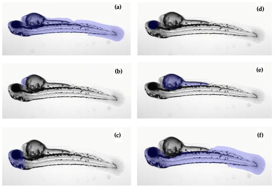 Example of all_fish (a), heart (b), head (c), eye (d), yolk (e), and length (f) masks used in the study.