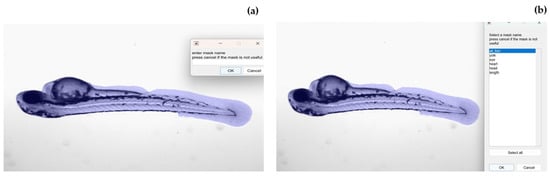 Six regions of interest (ROIs) were analyzed for each zebrafish: the whole fish, eye, heart, yolk, head, and length, as depicted in Figure 5. The user manually segmented each area, and for the first time, a unique name was assigned to each area (see Figure 6a), simplifying identification and tracking in subsequent stages of the radiomics workflow. After the analysis of the first image, the mask names were stored, allowing for easier selection from a list in subsequent analyses, as illustrated in Figure 6b.