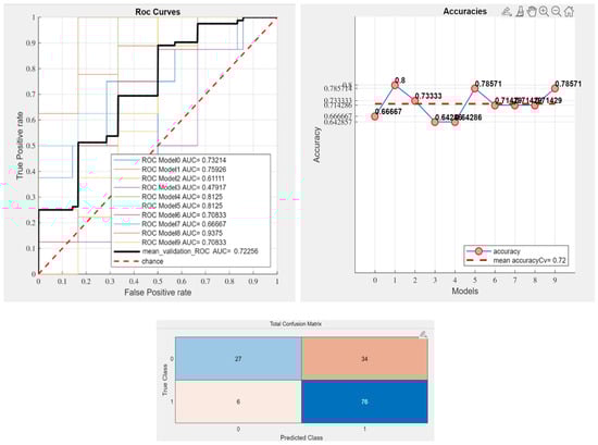 All the classifiers proposed by the program were used to train the predictive model, and k-fold stratified cross-validation with k=10 was used for validation. The ML algorithms integrated into matRadiomics are the default implementations from sklearn, the open-source ML and data modeling library for Python. For the KNN classifier, a k = 10 was chosen. This choice was made to balance model accuracy with stability. The k value represents the number of nearest neighbors used to classify each data point. Setting k = 10 provides enough neighborhood information to reduce classification variance, smoothing outliers and making predictions more reliable than lower values of k that can lead to overfitting and high sensitivity to noise. Additionally, k = 10 is often recommended based on empirical tests on datasets, where moderate values generally yield a good performance without causing excessive computational complexity. An example of the performance result (receiver operating characteristic (ROC) curve, accuracy, and confusion matrix) is shown in Figure 8.