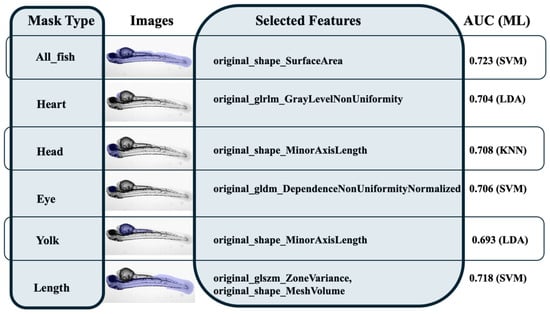 The classifiers, namely LDA, KNN, and SVM, exhibit varying degrees of success depending on the type of mask analyzed. For example, the whole-fish mask generally produced higher AUC scores across all classifiers, whereas individual masks (such as eye or heart) yielded more variable results. This observation suggests that comprehensive masks encompassing larger regions may be more reliable in predicting outcomes, likely due to the broader range of information they capture. Among the classifiers, SVM exhibited a slightly better performance compared to LDA and KNN, particularly for the whole-fish mask and length mask, with an AUC of up to 0.723. The performance of each classifier remains highly dependent on the specific features selected, as evidenced by the variation across masks. These results reinforce the importance of a careful feature selection to avoid overfitting. Figure 9 summarizes, for greater clarity, the best results achieved for each mask, along with the corresponding selected features and the predictive model that demonstrated the highest performance.