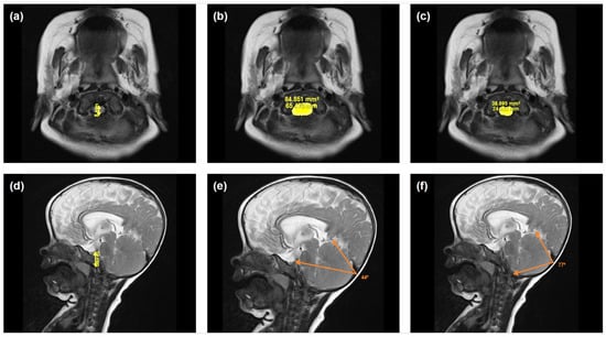 Illustrative examples of selected anatomical structures measured from magnetic resonance imaging scans from a child with achondroplasia. Shown are images used to calculate the following parameters: (a) foramen magnum diameter, (b) foramen magnum area, (c) myelon area, (d) clivus length, (e) tentorium angle, and (f) occipital angle.