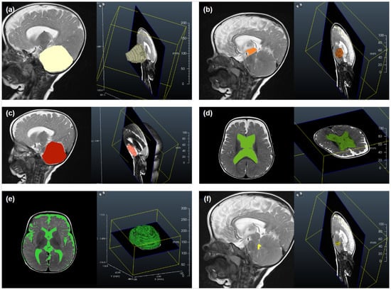 Illustrative examples of selected anatomical structures measured from magnetic resonance imaging scans from a child with achondroplasia, including screenshots of the data segmentation process using Dornheim Segmenter Research software (v2019.1; Dornheim Medical Images GmbH, Magdeburg, Germany). 3-D reconstructions of the following segmented structures are shown: (a) posterior fossa volume, (b) proportion of brainstem volume outside the posterior fossa, (c) cerebellum volume, (d) supratentorial ventricular system volume, (e) intracranial cerebrospinal fluid system volume, and (f) fourth ventricle volume.