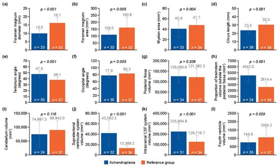 Analysis of the following anatomical parameters on magnetic resonance imaging scans in children with achondroplasia compared with the reference group: (a) foramen magnum diameter, (b) foramen magnum area, (c) myelon area, (d) clivus length, (e) tentorium angle, (f) occipital angle, (g) posterior fossa volume, (h) proportion of brainstem volume outside the posterior fossa, (i) cerebellum volume, (j) supratentorial ventricular system volume, (k) intracranial cerebrospinal fluid (CSF) system volume, and (l) fourth ventricle volume. Mean (standard deviation [SD]) data are shown. p-values are from Mann–Whitney U tests for independent samples.