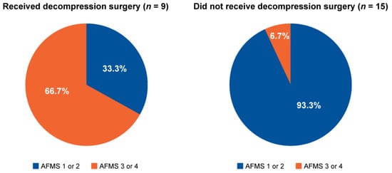 Proportion of patients who did/did not receive decompression surgery who were retrospectively graded as candidates for decompression surgery based on application of the Achondroplasia Foramen Magnum Score (AFMS) to magnetic resonance imaging scans.