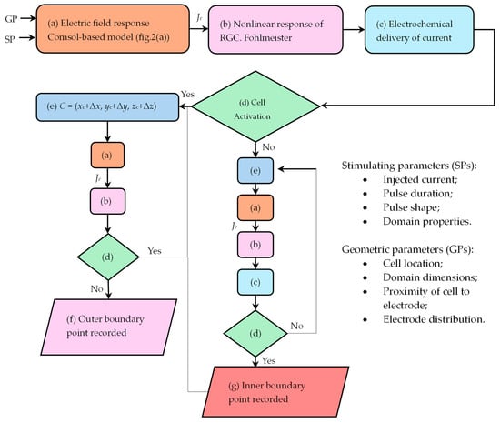 Stimulating parameters (SPs) and geometric parameters (GPs) are inputted in step (a) of the algorithm, see Figure 1, to obtain the electric field and the peak boundary current density of RGC, Jc, using the time-dependent Electric Currents Module in COMSOL Multiphysics. Step (b) uses Jc as an input to drive the stimulation of the RGC Fohlmeister [30] circuit model. If activation is achieved, the electrochemical safety is tested (step (c) in Figure 1).