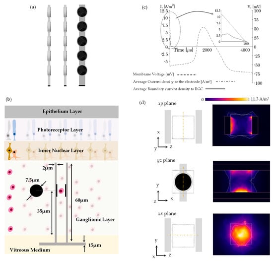 Figure 3b depicts a sketch of the layers of the retina along the vertical section. The linear carrier element length is used for positioning inside the ganglion layer. In this study, the penetrating electrodes were placed at the highest cell density, 1 mm away from the foveal center in the superior direction. This location is equal to 31,300 mm−2 RGC area density [36], 60 µm ganglion layer thickness [37], and 10 µm RGC diameter [38,39]. Villarreal [40] provided a 3rd-order polynomial that described the volumetric density as a function of the ganglion layer thickness and the RGC area density. Using those values, they indicated that the active and ground electrodes are located face-to-face with a peak volumetric cell density of 8.05 × 10−4 µm−3. The cube volume explained earlier is 1.24 × 103 µm3, and the cube length (or inter-linear carrier length) is 10.75 µm.