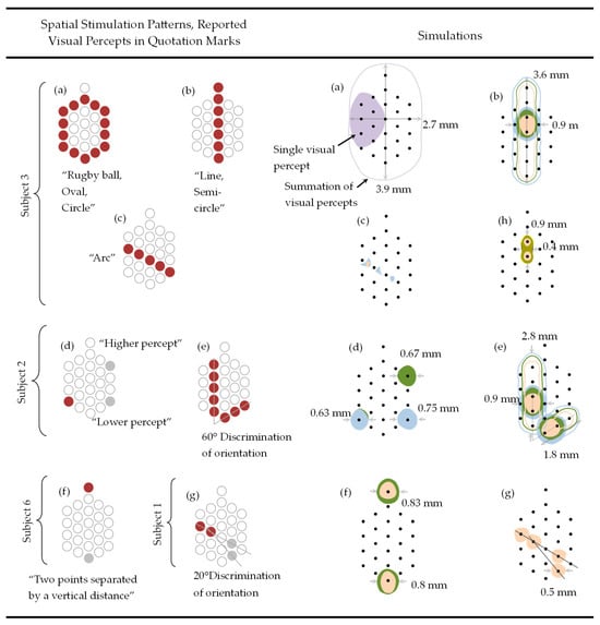 Figure 4 shows the spatial stimulation patterns and the reported visual percepts according to Klauke et al. [5] on the first column, and the results of our simulation using the 2D hexagon-shaped array on the second column. The first column is separated by subjects 1, 2, 3, and 6 (according to [5]) included in this study. The subjects’ reported visual percepts are shown below each spatial stimulus pattern. The peak current amplitude and pulse width were held constant at 13 μA and 94 μs, except for in Figure 4h, where our algorithm was tested for dot-like stimulation using 13 µA and 26 µA.