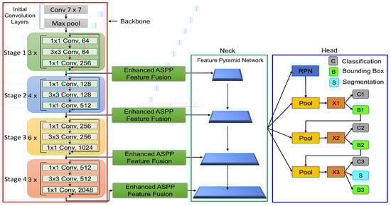 Figure 2 depicts the architecture of our proposed technique, which is based on the Cascade Mask R-CNN [23] framework. It is made up of three main components: the backbone, the Feature Pyramid Network (FPN) [45], often known as the neck, and the detection and segmentation head. In Figure 2, the red rectangle box shows the backbone network. The input X ∈ is fed to the backbone network for feature extraction. Initially, we used 7 × 7 convolution layers with a stride of two, which provides a larger receptive field to capture basic features like edges and patterns, and the max pooling layer was used for dimension reduction and to reduce the computational cost. Next, the model contains four stages, from one to four. Each stage consists of a different number of bottlenecks as shown in Figure 2. The bottleneck contains a set of three convolution layers: 1 × 1 is used to reduce the feature dimension to make the network efficient, 3 × 3 is used for feature extraction to capture complex patterns, and lastly, 1 × 1 is used to expand the feature to higher dimensions to make it forward to the next stage. Additionally, each bottleneck adds skip connections to avoid the vanishing gradient problem. Stage 1 (green block) consists of 3 bottlenecks, which capture edges, corners and textures. Stage 2 has 4 bottlenecks, which can extract more complex features. Due to the increase in network depth at Stage 3, which has 6 bottlenecks, more higher-level features can be extracted. At this stage, the feature maps encode semantic information better than spatial information, making them useful for detection and classification. The final Stage 4 includes 3 bottlenecks with the most abstract features and helpful information. The output features of each stage, such as Fi∈ {256, 512, 1024, 2048}, are compressed and refined by our enhanced ASPP feature fusion module. The enhanced features are sent to the Feature Pyramid Network.