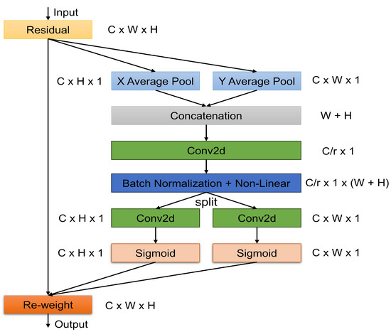 where the global pooling operations are horizontally and vertically denoted as and , respectively. Second, to create CA, we have to aggregate the two attention maps and , and apply point-wise convolution and non-linear activation. Equations (6) and (7) are given in the following: