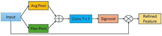 After applying channel-wise and coordinate-based attention, spatial attention enhances the model’s focus on the important features reside spatially. As shown in Figure 6, consider the input feature ICxHxW. We apply max pooling and average pooling across the channel axis to create 2D feature maps with dimension . After concatenating the two feature maps using ⨁, it generates effective feature maps with dimension . To create a spatial attention map, a convolution layer with a kernel size of 7 × 7 is used, and the sigmoid function is applied. Finally, Equation (9) is given as follows: