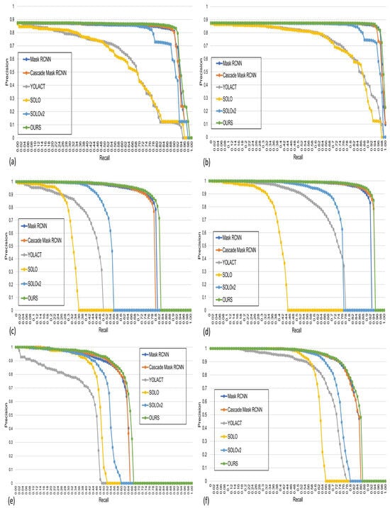 Figure 7 evaluates the PR curve for five benchmark instance segmentation models, Mask RCNN, Cascade Mask RCNN, YOLACT, SOLO, SOLOv2, and ours, for the ShipSG dataset, where the first row represents C75(a) and C50(b), respectively. The graph shows that the proposed model considerably outperforms the state-of-the-art models, represented by the green color, followed by the Mask RCNN and Cascade Mask RCNN models. Since all the models have high accuracy, successful predictions have minimal false positives. Furthermore, we observe that the recall values lie roughly between 0.95 and 0.99 for C75, and 0.98 and 1.00 for C50, which shows that our model performs best for both metrics compared with the other models. Our model maintains high precision with high recall, as seen in Figure 7, proving its robustness and stability in ship instance segmentation.