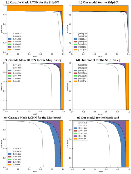 Error analysis via PR curves for three marine datasets. The 1st row shows the error analysis for ShipSG: (a) Cascade Mask RCNN, and (b) ours. The 2nd row displays the error analysis PR curve for ShipInsSeg (c) representing Cascade Mask RCNN and (d) ours. Finally, the 3rd row shows the MariBoats error analysis PR curve: (e) Cascade Mask RCNN and (f) ours.