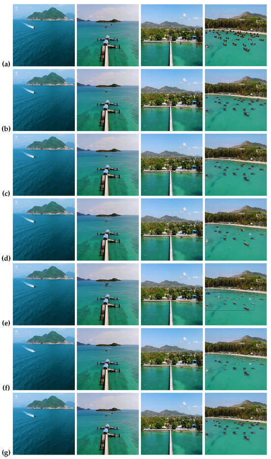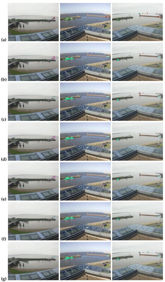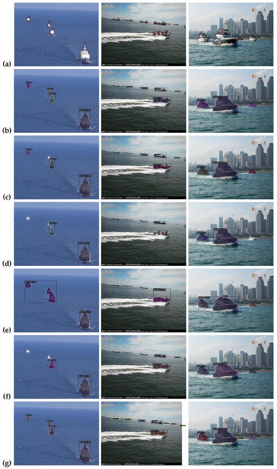 In this section, we discuss the visual comparison of our method on three marine datasets: ShipSG, ShipInsSeg, and MariBoats. We compare five benchmark instance segmentation models arranged accordingly for all datasets, namely, (a) ground truth, (b) Mask RCNN, (c) Cascade Mask RCNN, (d) YOLACT, (e) SOLO, (f) SOLOv2, and (g) ours as shown in Figure 9, Figure 10 and Figure 11, respectively. Based on the visual results obtained from the comprehensive experiments, we demonstrate the effectiveness of our proposed methodology, which is evident in its ability to detect and segment ships.