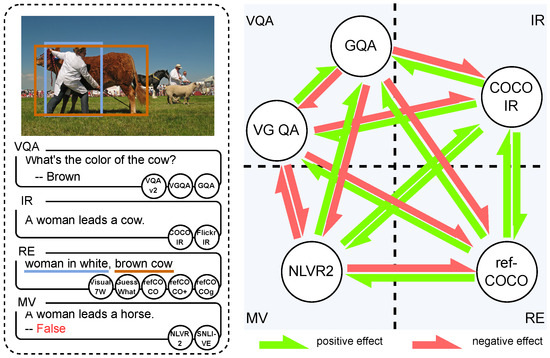 - Lu, J.; Goswami, V.; Rohrbach, M.; Parikh, D.; Lee, S. 12-in-1: Multi-Task Vision and Language Representation Learning. In Proceedings of the CVPR, Online, 14–19 June 2020; pp. 10434–10443. [Google Scholar]