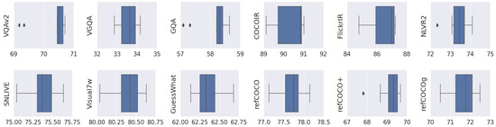- Datasets. We used the same set of datasets as [15], including the training and test sets of the 12 tasks. The overlapping samples from the different tasks were removed from the training sets to prevent data leaking from the test set into the training set. Note that the original test sets were not changed during this cleaning process. For the training and validation sets, VQA v2, VG QA, COCO IR, and NLVR2 had about 100,000 images; GQA and GuessWhat had about 60,000 images; Flickr30K IR and SNLI-VE had about 30,000 images; and refCOCO, refCOCO+, refCOCOg, and Visual7w had about 15,000 images.