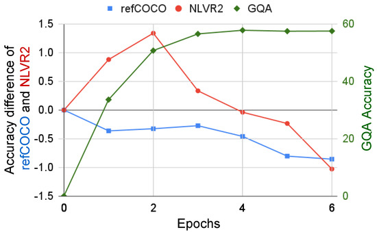 - Optimal transfer point. From our experiments, we observe that although GQA usually brings negative effects to other tasks, modifying the training setting of GQA during the pre-training step (e.g., decreasing the data scale of the GQA dataset or the training epochs of GQA) could make GQA a positive transfer to other tasks. These results may indicate that there is an optimal transfer point of knowledge transfer when the model learns just enough knowledge from the source task s but does not overfit. However, finding the optimal transfer point is a challenging task as the verification of the performance of model needs another round of training and evaluation. We consider finding the optimal transfer point as one of our future work.
