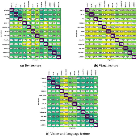 - Intra-group analysis: tasks in the same group tend to improve each other, but not always. Tasks in the IR, MV, and RE groups help other tasks in the same group to achieve better performance. However, tasks in the VQA group show a different behavior: only half of the intra-class relationships are positive. This indicates that (1) the defined task groups based on shared goals may be superficial and not a good representation of the internal type of knowledge in each task, and (2) having a shared goal may be favorable, but it is not enough for successfully transferring knowledge between tasks.