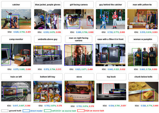 - GuessWhat is a referring expression task based on the GuessWhat dataset [46]. In this dataset, there are 66 K images with 137 K region-text pairs. The same as Visual7w, GuessWhat evaluates models’ performances by the object prediction accuracy with IoU .