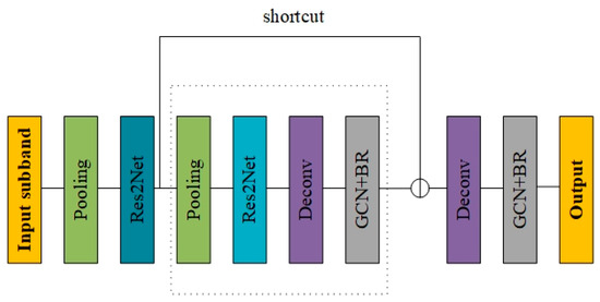 Res2Net [38] is proposed on the basis of Resnet [41] and shows better performance. Compared with Resnet, Res2net adds smaller residual blocks to the original structure of residual units to increase the size of each layer of the perceptual field of view, and at the same time, Res2Net can be well integrated into other network structures to improve the performance of other networks. The network structure is shown in Figure 3. The snow-containing images are decomposed into six high-frequency images and two low-frequency images after being changed by DTCWT, where each image corresponds to a sub-band. After inputting the sub-band into the model, they first pass through the pooling layer before entering the Res2Net network, which is performed to reduce the number of parameters and computation to prevent the model from overfitting. Using Deconv can effectively reduce the noise in the image and make the feature map smooth. Also, using the image segmentation network GCN+BR after the Deconv layer can effectively improve the performance of the network model [42].