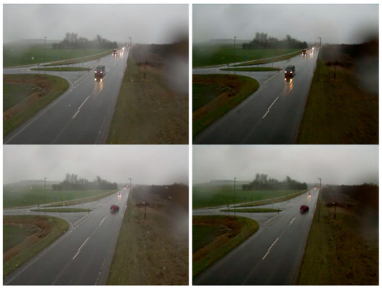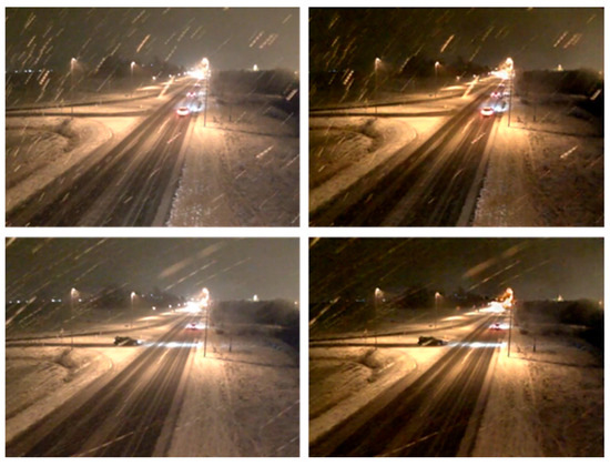 The accuracy of the model is further tested using the AAU dataset. The test sample is 30,000 images from the vehicle surveillance video, containing a total of 4300 vehicle samples, and after being processed by the snow-removal model, the images are shown in Figure 4.