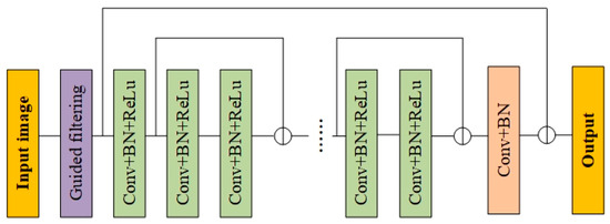 To address the above problems, the sparsity features of snow streaks have been used as the prior knowledge of the images, the original images have been divided into detail and low-frequency layers by guiding filters, and Resnet and negative mapping have been adopted for the base structure of the model. The network structure is shown in Figure 6.