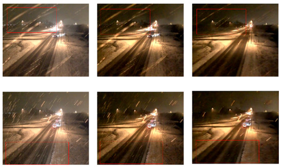 It can be seen that the correct rate of traffic flow detection in snowfall weather can be effectively improved by using the snow-removal method proposed in this paper. However, the performance when using this method in the presence of snow streaks is poor, which is because the double-tree complex wavelet transform can effectively detect snow particles in different directions, but the lack of snow streaks cannot be detected accurately, as shown in Figure 5.