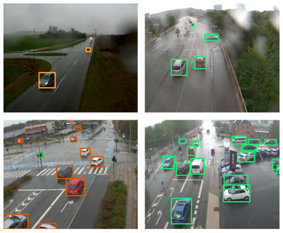In order to meet the detection speed as well as to obtain accurate detection results on large-scale datasets, yolov5 has been used as a detection tool. yolov5 uses CSPDarknet53 as the backbone and adds mosaic data enhancement and adaptive anchor frame calculation and other calculations on the input side, which greatly enriches the detection dataset. In particular, the mosaic data enhancement random scaling enhances many small targets, which improves the robustness of the network. Meanwhile, the FPN + PAN [43,44] structure is applied in the network structure, and a bottom-up feature pyramid is added after the traditional FPN layer. The FPN layer conveys strong semantic features from the top down, while the feature pyramid conveys strong localization features from the bottom up to achieve the purpose of parameter aggregation from different backbone layers to different detection layers, develops a feature map with less information loss, and enhances the detection capability of the network. Figure 8 shows video images from the AAU dataset are used to test the vehicle detection efficiency, which contains a total of 25 min of video information and 30,000 images of traffic flow with 640 × 480 resolution that are input into yolov5.