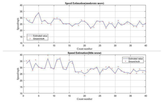 Figure 10 shows the comparison of estimated speed and ground truth speed for the two cases. The accuracy and other detailed information are shown in Table 3. Video 2 has a high accuracy of 97.2% for the speed estimation; it can be seen that the accuracy of video 2 is higher than that of video 1. The videos were examined individually, revealing the inclusion of a greater number of trucks and sparser snow particles in video 1. Consequently, the accuracy of speed estimation in video 1 was diminished. However, in general, the proposed framework in this paper achieved good estimation performance in both light and moderate snow conditions.