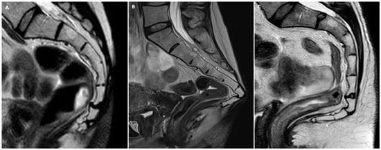 The morphology of the sacrococcygeal spine, whether curved (type 1), squared (type 2), or mixed (type 3), as seen on midsagittal MR T2w images (Figure 1), has relevance when drawing the reference line for the assessment of pelvic organs’ position during the various maneuvers. Any visible congenital abnormality must also be reported.