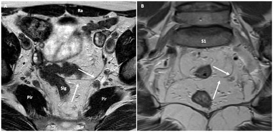 The highest priority is given to the levator ani (LA) muscle, which should be described and displayed separately in its three components: the iliococcygeus, pubococcygeus, and puborectalis muscles. Any discontinuity (tear), avulsion, thickness asymmetry, abnormal signal intensity, and/or fat replacement should be noted in the report. The mean thickness of both sides (calculated as the thickness of the thicker limb plus the thickness of the thinner limb, divided by two) and the degree of asymmetry (calculated as the thickness of the thicker limb divided by the thickness of the thinner limb) should be measured. The thresholds not to be exceeded are 4.4 ± 1.6 mm for thickness and 1.4 ± 0.5 mm for asymmetry, respectively []. Due to their frequent involvement in pelvic floor dysfunctions, the same considerations apply to the piriformis muscle, obturator muscle, and transverse perineum muscle.